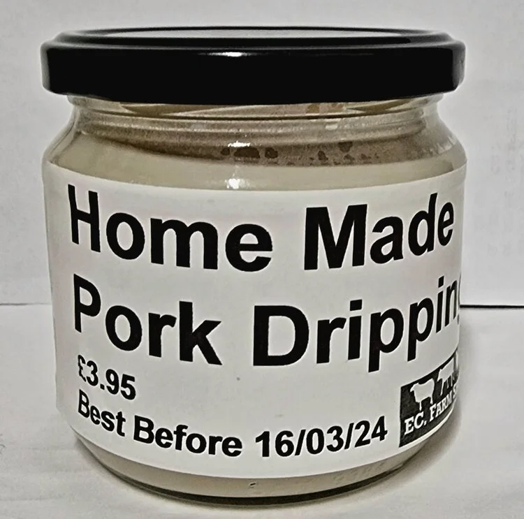 Christmas Shop › Homemade pork dripping Image 1 of 1 Homemade pork dripping £3.95 MADE BY RENDERING OUR FREE RANGE PORK FAT TO GIVE A TRADITONAL FLAVOURSOME COOKING FAT Quantity: Add To Cart Added! MADE BY RENDERING OUR FREE RANGE PORK FAT TO GIVE A TRADITONAL FLAVOURSOME COOKING FAT